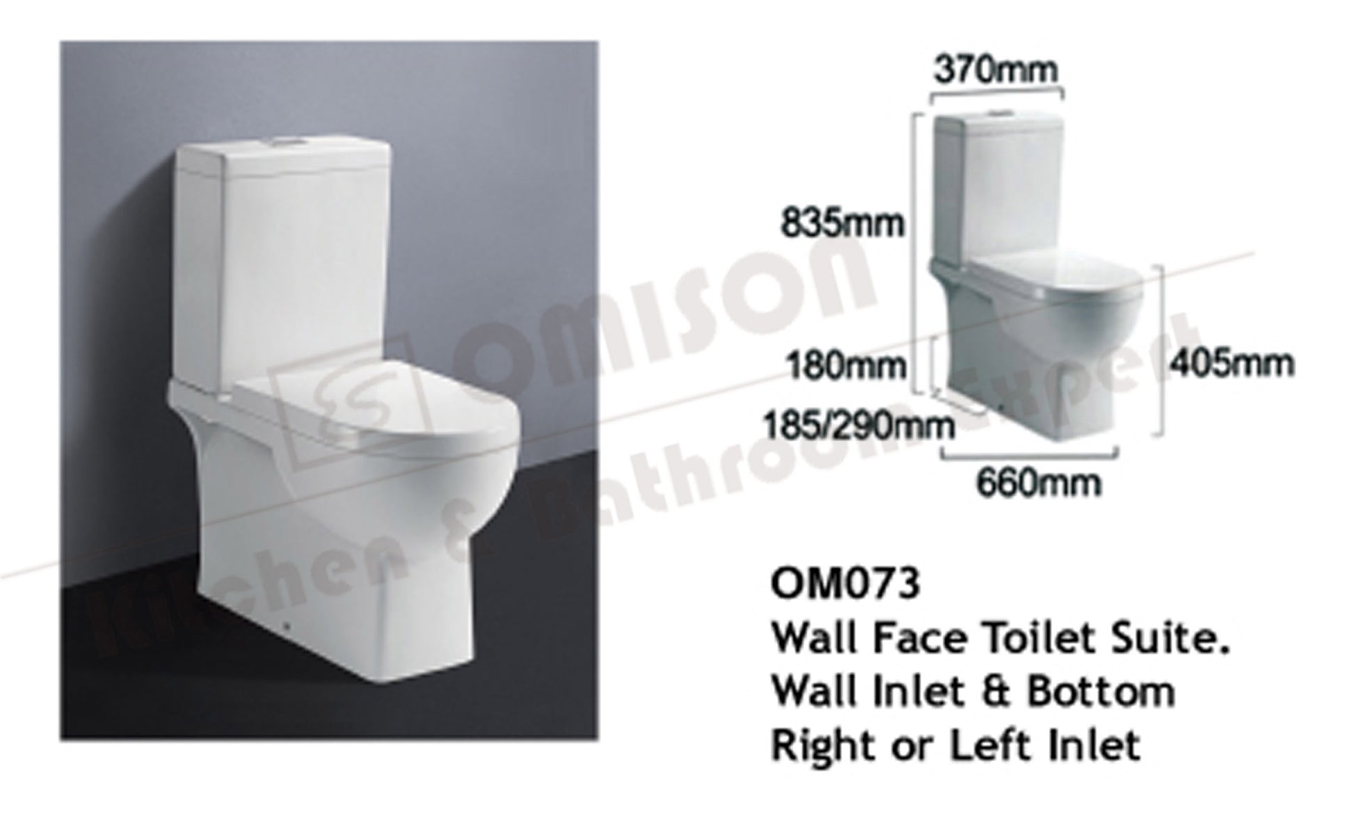 Size: 660*370*835mm Close coupled design Soft close Seat. Two-pieces Vitreous China toilet P trap: 180mm offset (Pipe to wall) S-trap: 185-290mm offset (Pipe down to floor) you can buy connector for S trap seperately from us "WELS" Water rating efficiency **** (4 star) Dual Flush 4.5/3L